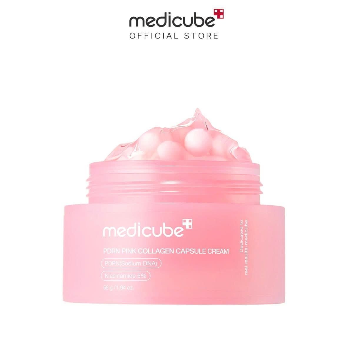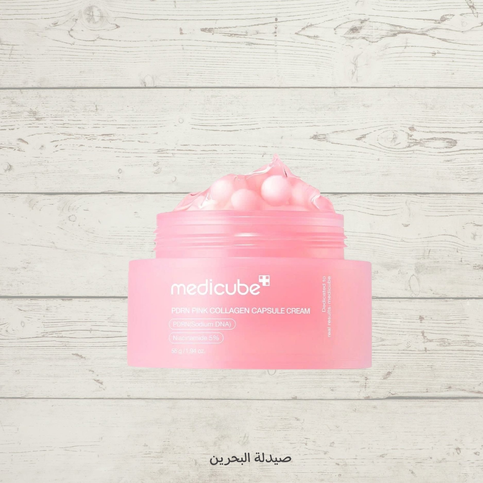ميديكيوب PDRN Pink Collagen Capsule Cream باللغة العربية، مع التركيز على المكونات الرئيسية (PDRN، النياسيناميد 5%) والفوائد: