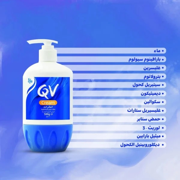 QV Cream هو منتج للعناية بالبشرة مصمم خصيصًا لترطيب وحماية البشرة الجافة والمتهيجة. يتميز بتركيبته الغنية التي تحتوي على مكونات تساعد على تحسين رطوبة البشرة وتقويتها. يتم استخدامه عادة لعلاج جفاف الجلد، والحالات الجلدية مثل الأكزيما، والتهاب الجلد التماسي، والتشققات.